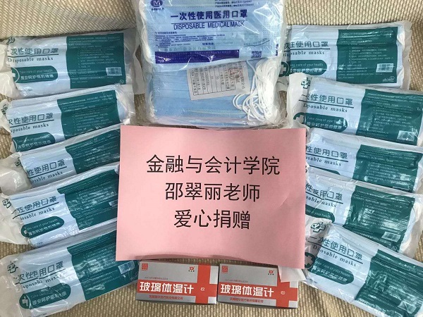 pa电子官方网站党委响应党中央和学校党委的号召,在师生中开展了爱心捐赠活动:2月22日,pa电子官方网站13级财务管理张春振校友向学校捐赠90瓶舒洁洗手液;2月23日邵翠丽副院长向学校捐赠一次性口罩400只,水银体温计20个;2月24日陈红玲夫妇向学校捐赠价值2000元的10斤装二氧化氯消毒液21套…….。一个个数字虽不是那么注目,但心系祖国、爱校如家的爱心是可贵的,“不忘初心、牢记使命”的担当精神是无价的。我们相信随着千千万万白衣天使奔赴疫区,千千万万名中华儿女投入战“疫”,千千万万股暖流汇聚成河,病毒终将被消灭,春天很快会到来。
