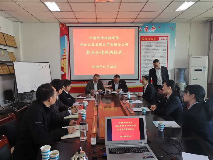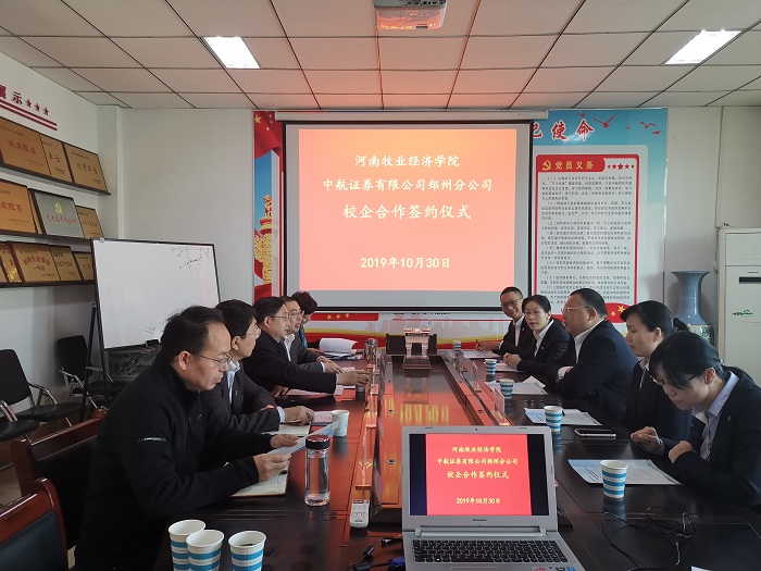 10月30日上午,中航证券有限公司郑州分公司—河南牧业经济学院校企合作协议签署仪式在英才校区教学楼pa电子官方网站会议室514室举行。中航证券有限公司郑州分公司总经理叶常伟、运营管理部经理李颖、郑州商务外环路营业部总经理田彦华等出席签约仪式。pa电子校长罗士喜、校长办公室主任贾江、pa电子官方网站院长黄良杰、副院长贾宪军、副院长王培玲等出席签约仪式。签约仪式由黄良杰主持。