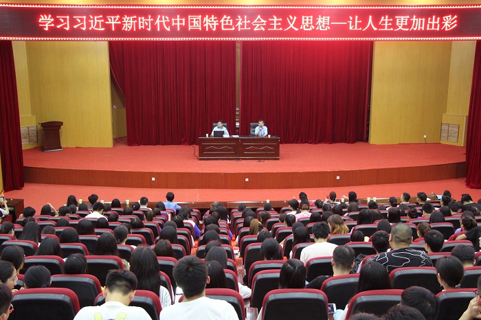 报告会上,罗校长以中华民族五千年的文明史为切入点,以在追求和实现中华民族伟大复兴的历程中中国共产党上下求索的艰辛历程为主线,以改革开放以来中国取得的巨大成就为事例,由表及里、由浅入深地系统地阐述了习近平新时代中国特色社会主义思想的重要意义、核心要义、理论品格、精神特质、历史贡献、丰富内涵;同时,罗校长结合国际国内形势,用详实的实例证明了中国共产党的初心和使命。如何使让自己的人生更加出彩呢?罗校长强调,青年大学生要用习近平新时代中国特色社会主义思想武装头脑;他指出:理想信念是实现出彩人生的不竭动力,正确的世界观、人生观和价值观是人生出彩的标杆,根据自己的智能结构特点做好人生规划、培养自己的核心竞争力是实现出彩人生的核心力量,刻苦学习、精益求精、读万卷书、行万里路是出彩人生的关键,身心健康是出彩人生的根基,将个人、母校、事业、祖国有机统一起来,打造一艘永不沉没的航空母舰为出彩人生保驾护航。最后,罗校长指出:一个时代有一个时代的主题,一代人有一代人的使命;开创新时代、实现中国梦,青年一代大有可为。他殷切希望青年大学生要志存高远,知行合一,修身立德,厚积薄发,以成长成才为己任,将实现人生价值与勇于担当社会责任紧密联系,将自己的青春梦想和价值追求融汇在实现中国梦的大潮中,做走在时代前列的奋进者、开创者和奉献者,让自己的人生更加出彩。罗校长还为大学生们推荐了《习近平的七年知青岁月》一书,并倡议青年学生认真研读,做一个爱学习、爱读书、爱思考,有思想的新时代大学生。