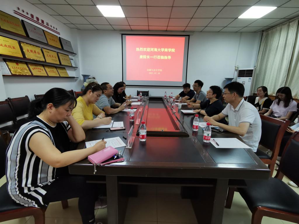 7月18日下午,河海大学商学院院长唐震、教师胡兴球等一行来pa电子官方网站调研交流,院长黄良杰、副院长邵翠丽、金融学教研室主任宋晓薇等参加座谈会。