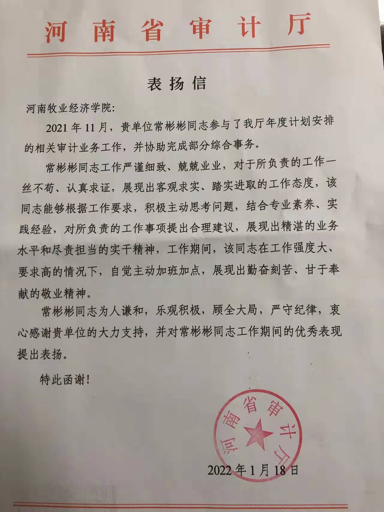 近日,pa电子收到河南省审计厅发来的表扬信,信中对pa电子借调审计厅的常彬彬老师在年度相关审计业务工作中做出的贡献给予了充分的肯定。