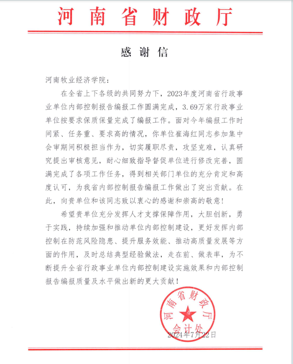 7月23日,pa电子收到河南省财政厅会计处发来的感谢信,感谢副院长崔海红在2023年度河南省行政事业单位内部控制报告会审过程中,积极担当作为,切实履职尽责,攻坚克难,认真研究提出审核意见,耐心细致指导督促单位进行修改完善,圆满完成了各项工作任务。崔海红博士的专业水平和敬业精神得到相关部门单位的充分肯定和高度认可,为我省内部控制报告编报工作做出了突出贡献。河南省财政厅会计处向pa电子和崔海红同志致以衷心的感谢和崇高的敬意!