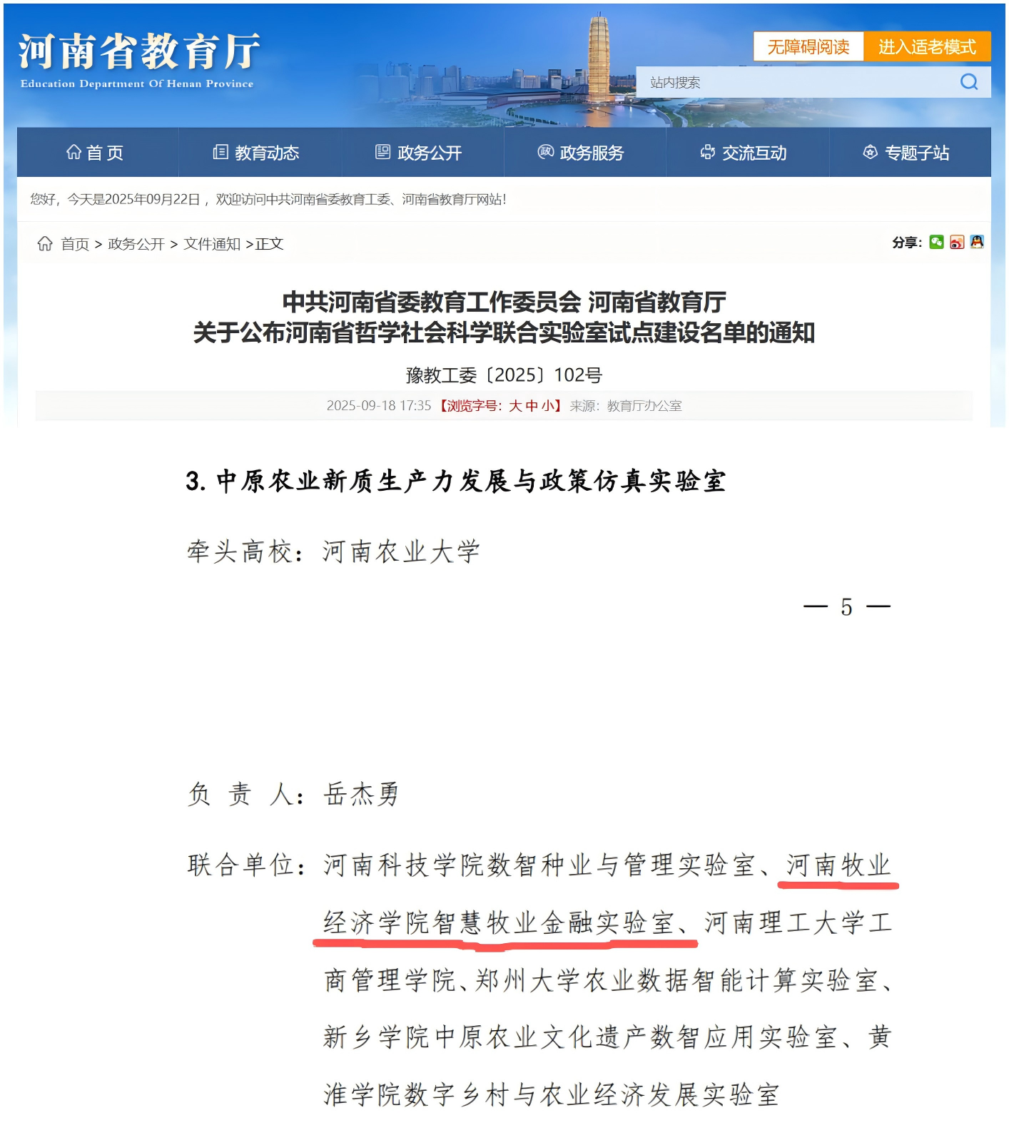 近日,中共河南省委教育工作委员会、河南省教育厅公布了首批河南省哲学社会科学联合实验室试点建设名单。由pa电子作为主要协同单位联合申报的“中原农业新质生产力发展与政策仿真实验室”成功入选。