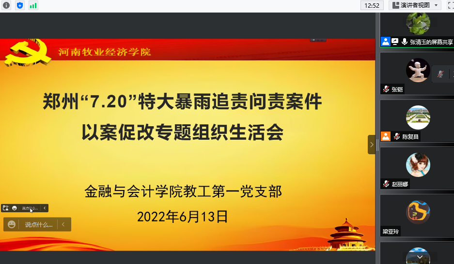 2022年6月13日上午,pa电子官方网站教工第一党支部召开“7·20”特大暴雨灾害追责问责案件以案促改专题组织生活会。学院党委书记陈复昌、党委副书记汪晓伟及第一党支部全体教工党员参加会议,会议由党支部书记张清玉老师主持,通过腾讯会议的形式进行。