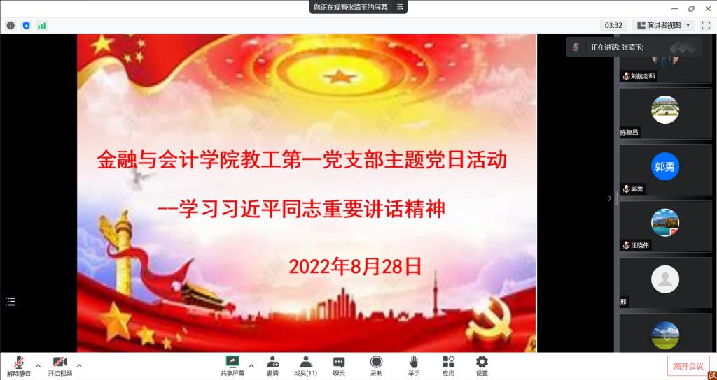 2022年8月28日,pa电子官方网站教工第一党支部举行主题党日活动,采用线上会议形式举行。本次主题党日活动的主题是围绕学校7、8月份主题党日活动安排进行理论学习与研讨,并学习习近平总书记给“中国好人”李培生、胡晓春回信精神,会议由支部书记张清玉同志主持。