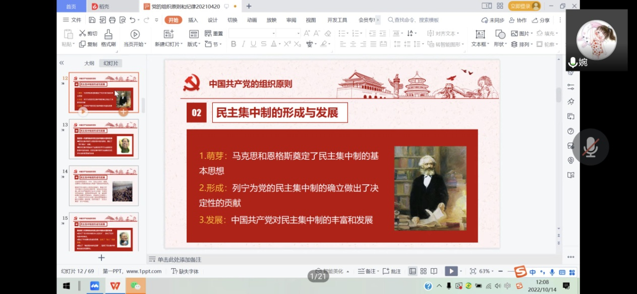10月14日中午,pa电子官方网站在线上开展了2022年第二期入党积极分子培训班第七讲,党课主题为《党的组织原则、纪律和作风》,本次党课由pa电子官方网站学生第二党支部书记葛婉老师主讲。