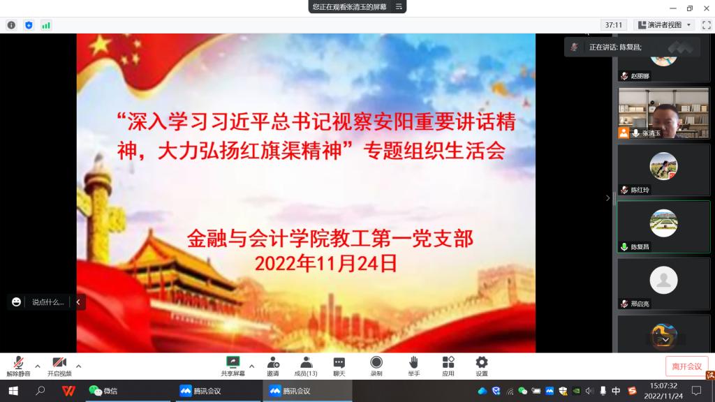 2022年11月24日下午,pa电子官方网站教工第一党支部召开“深入学习习近平总书记视察安阳重要讲话精神,大力弘扬红旗渠精神”专题组织生活会。会议由党支部书记张清玉同志主持,支部全体党员参加会议,校纪委副书记杨成同志及校纪委副科级纪检监察员张馨亓同志列席会议。