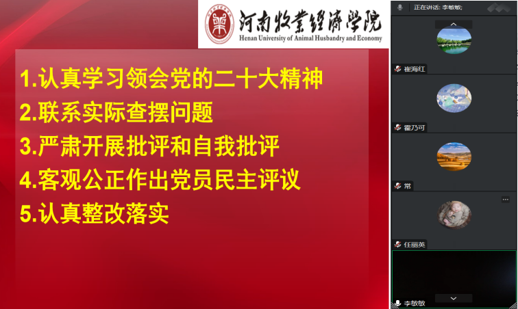 最后,黄良杰院长对组织生活会进行了点评指导和总结发言,指出此次组织生活会取得了预期成效,会上大家能够对照检查深刻剖析,将批评和自我批评相结合,务实高效的进行整改,提出了切实可行的整改措施。同时,指出了支部工作的一些不足和改进建议,并对2023年的支部工作提出了更进一步的要求。首先,黄院长强调在党员在进行查摆问题、开展批评与自我批评的过程中,要注重结合学习党的二十大精神和党务党建工作内容的充实性,应深刻领悟“两个确立”,增强“四个意识”、坚定“四个自信”、做到“两个维护”,将党的二十大精神贯彻到日常工作当中,将业务和党建融会贯通,随着线下党务和业务工作的有序推动,要不断改进和创新支部活动形式和内容,充分拓展党务学习的空间和时间,精心筹划各类形式的党务学习新方法、新形式,促进党建与业务深度深入融合。其次,党支部委员多为教研室主任,在未来工作开展过程中,需要更加注重一流专业申报、专业学科建设、社会服务建设等工作重点的侧重,从而为促进学科建设、提升专业的社会影响力奠定基础。最后,专业认证评估和专业结构转型工作需要提升党员教师们的教学、科研和社会服务能力,应加强示范带动专业教师提升教科研工作能力,为学院学科专业建设贡献党员力量,让学院工作再上新台阶。