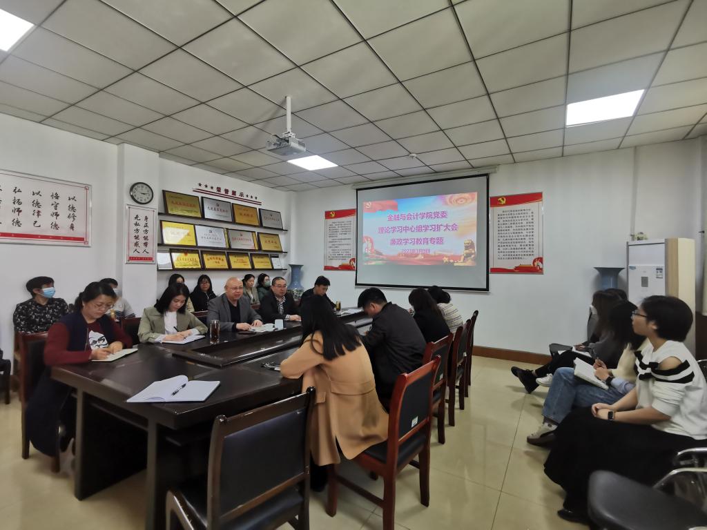 3月9日下午,pa电子官方网站在英才校区教学楼514会议室召开党委理论学习中心组学习(扩大)会,专题进行廉政教育学习活动,会议由学院党委书记陈复昌主持,学院科级及以上干部和各党支部书记参加学习。