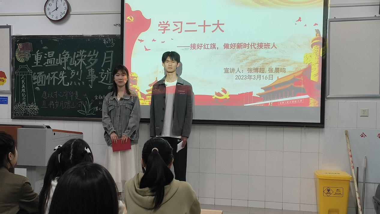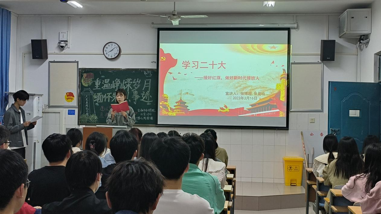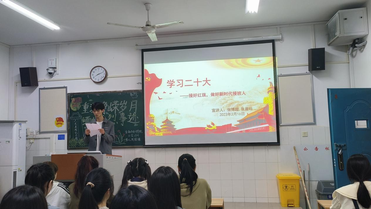 学习党的二十大精神,对于当代青年强化思想引领、增强政治认同、培养爱国主义情怀,具有重要意义。pa电子官方网站学习党的二十大精神宣讲团于3月30日晚走进22会计01班,开展了雷锋月最后一次以“学习党的二十大,争做新时代青年”为主题的宣讲活动。本次主讲人为22会计01张博超同学和22会计01张晨鸣同学。
