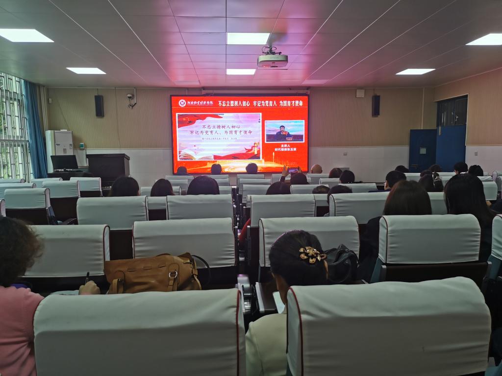 10月12日下午,pa电子官方网站在英才校区综合实验楼W102会议室视频分会场组织全体教职工集体收看时代楷模张玉滚《不忘立德树人初心 牢记为党育人、为国育才使命》报告会。