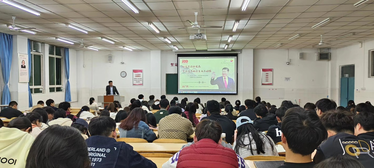3月21日晚7点,pa电子官方网站在W209教室举行2024年第一期入党积极分子培训班第三讲——《坚持和发展中国特色社会主义》,本次党课由学生第一党支部书记顾自卫主讲。