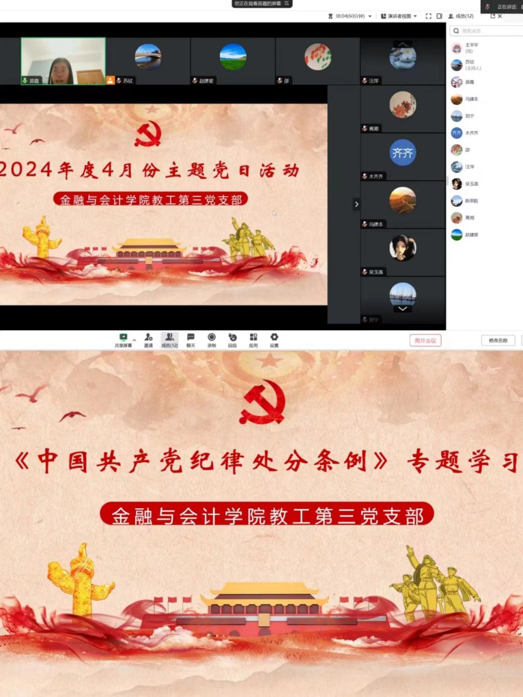 2024年4月30日下午,pa电子官方网站教工第三党支部以线上腾讯会议的形式开展了4月份主题党日活动暨新修订《中国共产党纪律处分条例》专题学习,支部全体党员参加,会议由支部书记苗霞主持。
