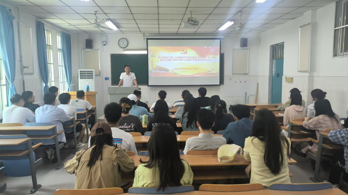 5月13日中午,pa电子官方网站学生第一党支部在教学楼A503教室举行五月份主题党日活动,学习《中国共产党纪律处分条例》和《加强文化遗产保护传承,弘扬中华优秀传统文化》内容,支部全体党员参加。活动由党支部书记顾自卫主持。
