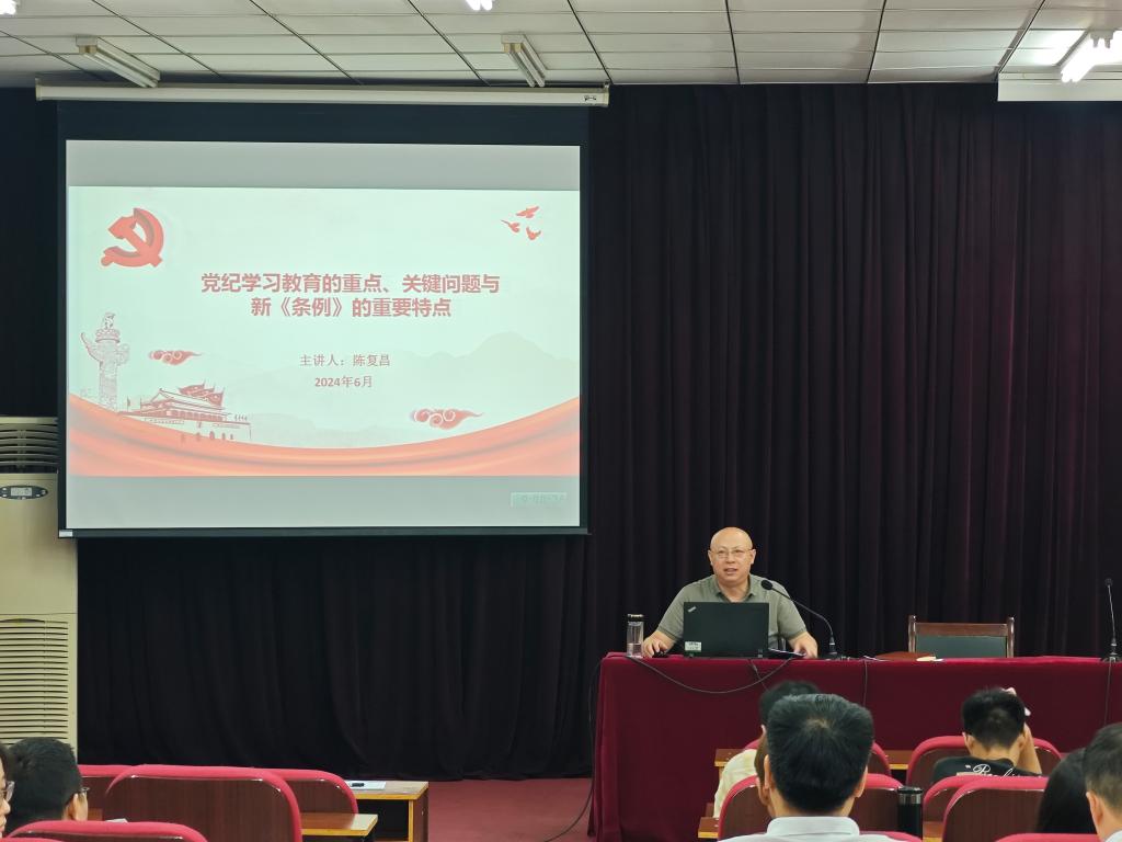 6月21日上午,pa电子官方网站党委书记陈复昌以“党纪学习教育的重点、关键问题与《条例》的重要特点”为题,在英才校区综合实验楼E109会议室为学院师生党员讲授党纪学习教育专题党课。