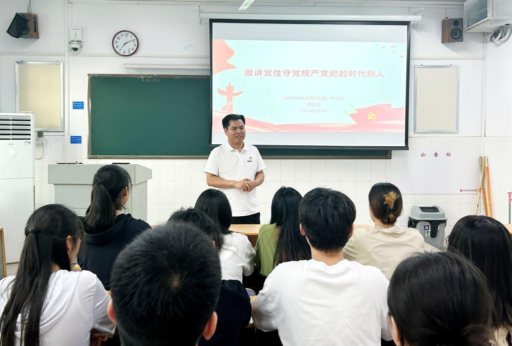 为深入开展党纪学习教育,引导广大学生党员严格执行和维护党的纪律,模范遵守国家法律法规,6月26日晚7点,pa电子官方网站学生第一党支部在教学楼A408开展支部书记讲党纪专题党课。学生第一党支部书记顾自卫以《做讲党性守党规严党纪的时代新人》为题,为支部全体学生党员授课。