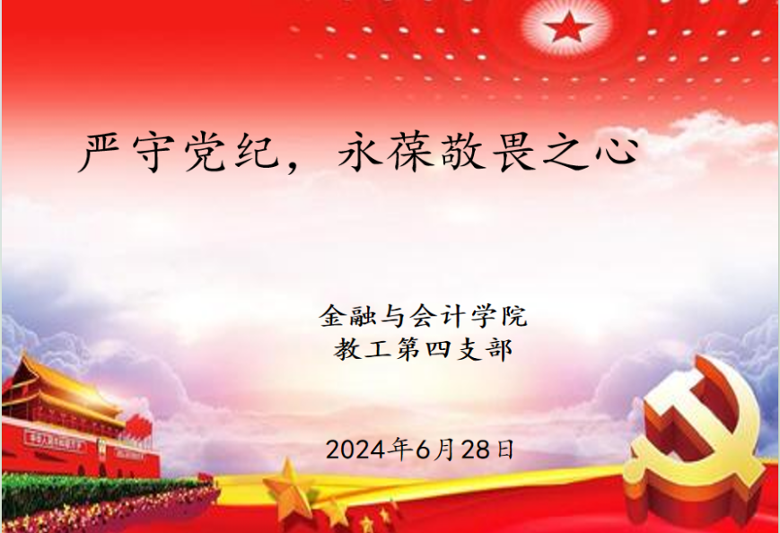 为进一步提升党纪学习教育成效,加强党员的纪律意识和自我约束能力,2024年6月28日上午,pa电子官方网站教工第四党支部书记王豪杰以《严守党纪,永葆敬畏之心》为题,为支部党员讲授了党纪学习教育专题党课,支部全体党员参加了学习与研讨。