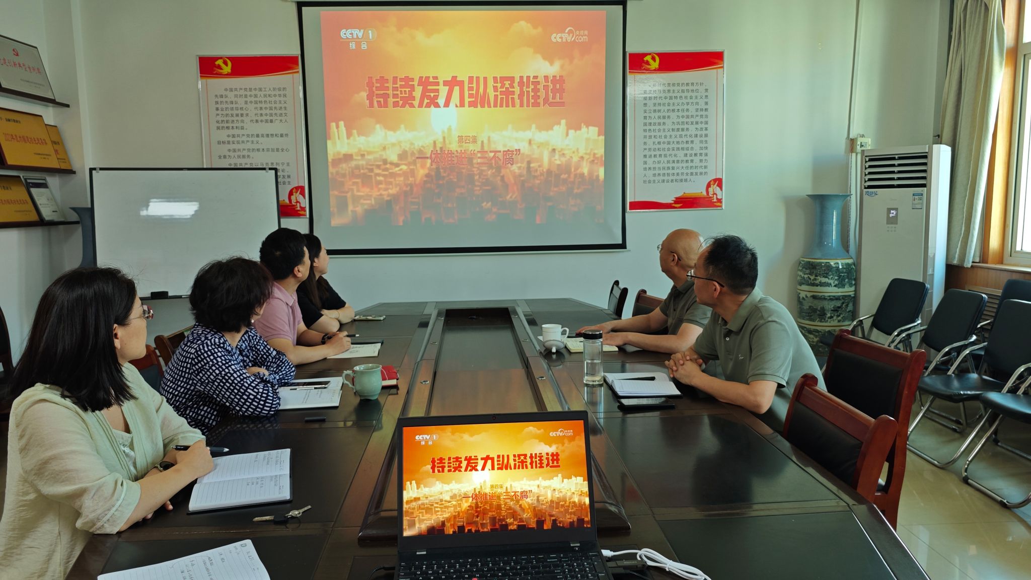 随后,与会人员共同观看了专题教育片《持续发力纵深推进》第4集《一体推进“三不腐”》。本集通过国家体育总局原副局长、中国足协原党委书记杜兆才,中国足协原主席陈戌源,中国国家男子足球队原主教练李铁等足球领域系列腐败案,中国人民银行原党委委员、副行长范一飞案,国家能源投资集团原党组成员、副总经理李东案,讲述我们党始终以最彻底的自我革命精神反腐败,紧盯重点问题、重点领域、重点对象,以零容忍态度反腐惩恶,一体推进不敢腐、不能腐、不想腐,坚决打赢反腐败斗争攻坚战持久战。