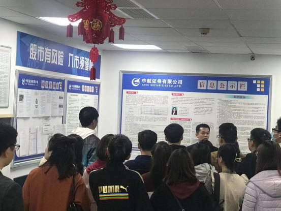 为深化校企合作,本学期17级投资学专业开展了校外实践课程。为促进的学生更好地掌握专业技能知识,增强对当前资本市场以及投资者行为偏好的理解,11月17日上午9:00,pa电子组织该专业学生在指导老师老师范聪颖的带领下前往中航证券商务外环营业部参观学习。