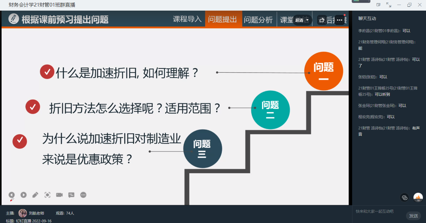 2022年9月16日下午,按照pa电子官方网站2022教学观摩课活动的统一安排,会计学教研室刘航副教授进行了研讨型教学观摩。观摩课采用钉钉直播形式进行。刘老师首先以龚自珍“落红不是无情物,化作春泥更护花”的诗句引入本次观摩课教学内容——固定资产折旧,通过对固定资产折旧的内涵讲解启迪同学们要珍惜新时代的幸福生活,勤奋学习,努力成长为服务经济社会发展的高素质应用型人才。在讲解固定资产直线法计提折旧后,刘老师以观看“固定资产加速折旧优惠扩至全部制造业”的新闻视频为切入点,启发同学们思考:什么是固定资产加速折旧?为什么说其是一种优惠政策?在固定资产的加速折旧讲解环节,刘老师采用案例教学,注重师生互动,通过在线交流共同理解加速折旧的理论内涵、计算方法及会计处理,并要求同学们课下收集上市公司资料,进一步学习加速折旧与直线法折旧对企业财务绩效的不同影响,理解疫情背景下国家出台优惠政策的重大意义。