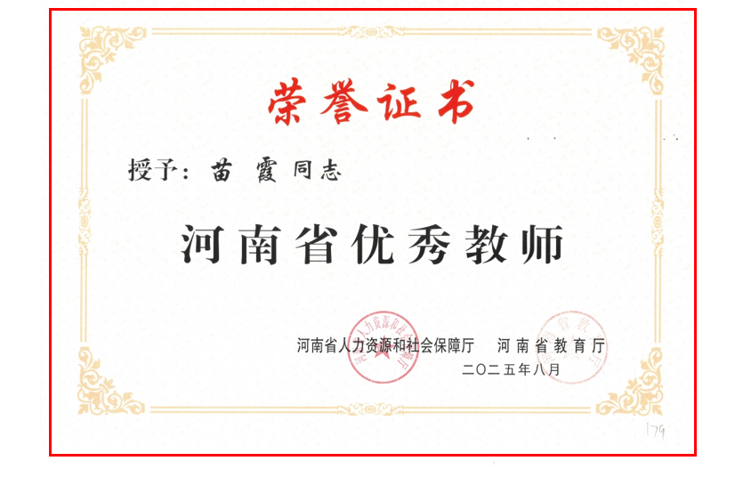 近日,河南省人力资源和社会保障厅、河南省教育厅联合下发文件,公布了河南省教育系统先进集体和先进个人名单,pa电子教师苗霞老师荣获“河南省优秀教师”荣誉称号。该荣誉经基层推荐、专家评审、结果公示、组织考察等多环节严格评定,是教育系统中颇具分量的省级荣誉。