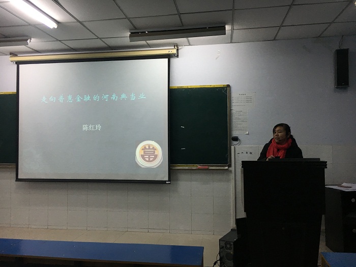 本学期金融学院继续开展院内教师系列讲座活动,为充分调动学生对专业知识学习的积极性,加强学生对金融市场相关知识的了解与典当行业的认知,于12月14日下午,在教学楼E102为pa电子15、17级典当班学生开展“走向普惠金融的河南典当业”的专题讲座,主讲人为pa电子陈红玲副教授。书记胡红林、贾宪军及部分教师出席并认真听取了本次讲座。本次讲座由贾宪军书记主持。