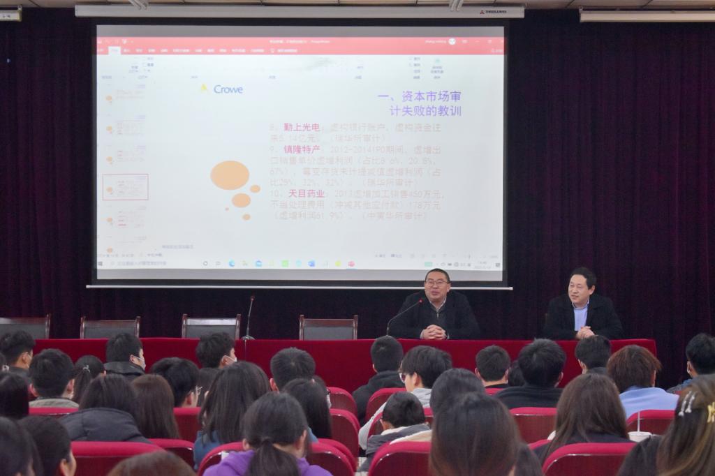 3月18日下午,pa电子官方网站特邀国富会计事务所合伙人张安峰在英才校区E110讲授以“职业怀疑,不啻是态度”为题的专题讲座。pa电子会计、审计专业学生代表在场聆听,活动由pa电子官方网站院长黄良杰主持。