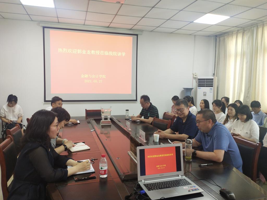 5月27日下午,pa电子官方网站特邀中国社会科学院教授、博士生导师郭金龙,在英才校区教学楼514会议室为师生作了题为《金融机制与家庭财富管理》的学术讲座。pa电子教师和学生代表在场聆听,本次活动由pa电子官方网站院长黄良杰主持。