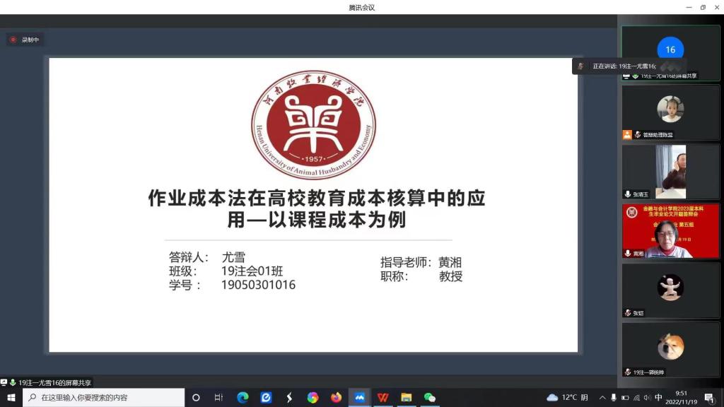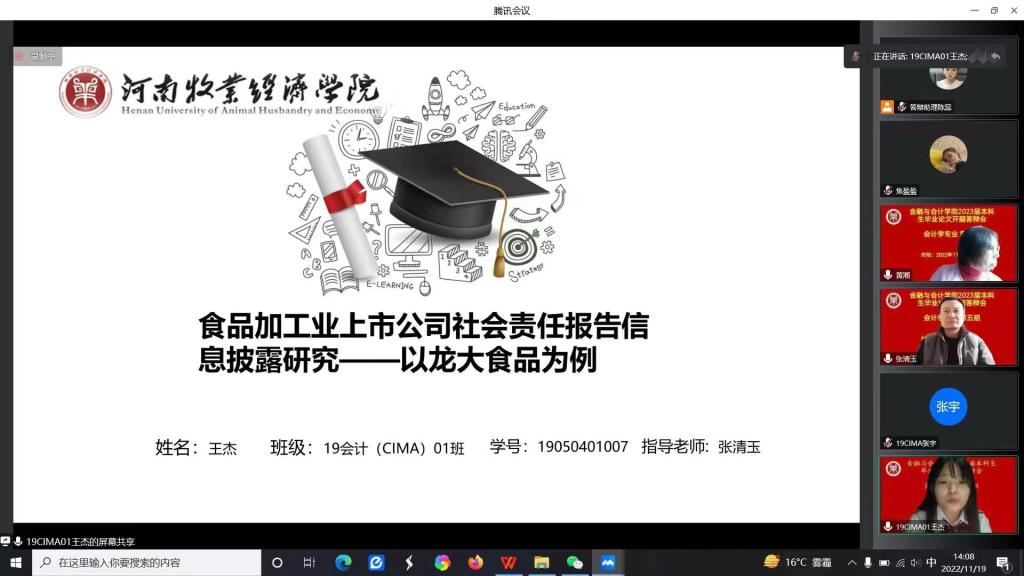 毕业论文工作是教学工作的重要组成部分,旨在对大学生综合实践能力和专业素养进行全面考核和综合检验。进行毕业论文开题答辩则是保证毕业论文工作顺利推进的重要环节。经过选题申报、师生互选、开题报告撰写等环节,2022年11月19日上午,pa电子官方网站会计学专业346名同学分为5个小组同时进行了毕业论文开题答辩工作。由于疫情影响,本次采用线上形式进行了开题答辩。