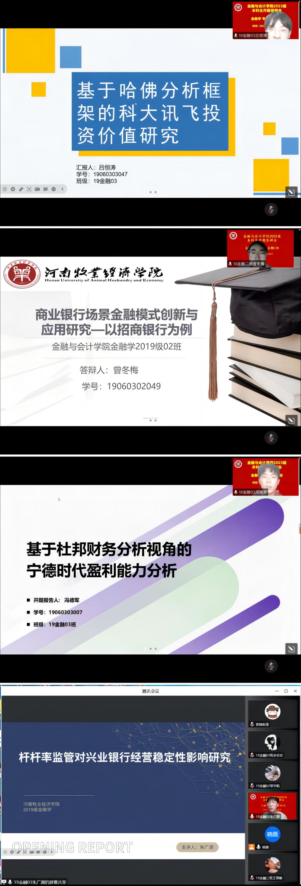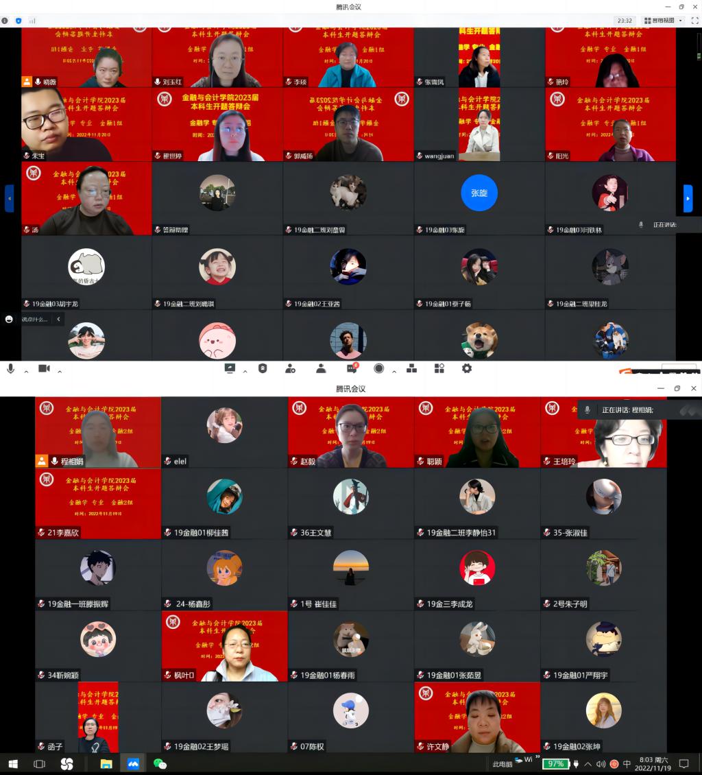 根据《河南牧业经济学院本科毕业论文(设计)工作条例》和《pa电子官方网站2023届本科毕业论文工作实施方案》的要求,pa电子2023届金融学本科专业毕业论文开题答辩于2022年11月19日、20日两天举行,本次答辩采用线上方式举行,共分为两个答辩小组,共有163名学生和19名指导老师参加开题报告答辩会。