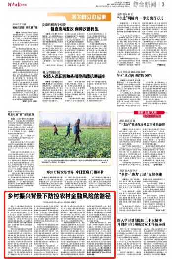 2022年12月16日,《河南日报》农村版第三版刊发pa电子张清玉老师理论研究论文:《乡村振兴背景下防控农村金融风险的路径》,文章从加强党的领导、完善相关法规、激发产业发展活力、完善信用体系、健全内部控制、培养高素质金融人才等方面提出农村金融风险防控的系统性框架。