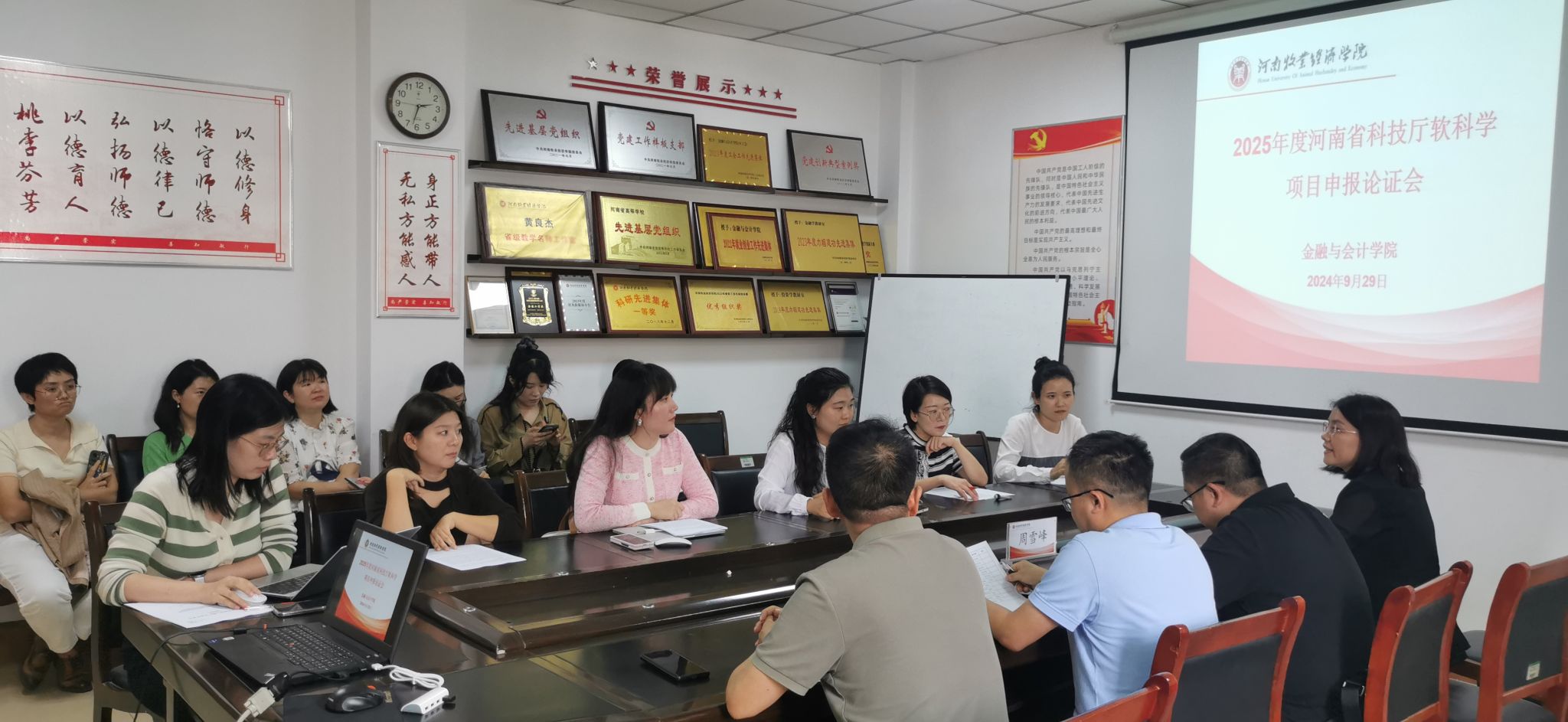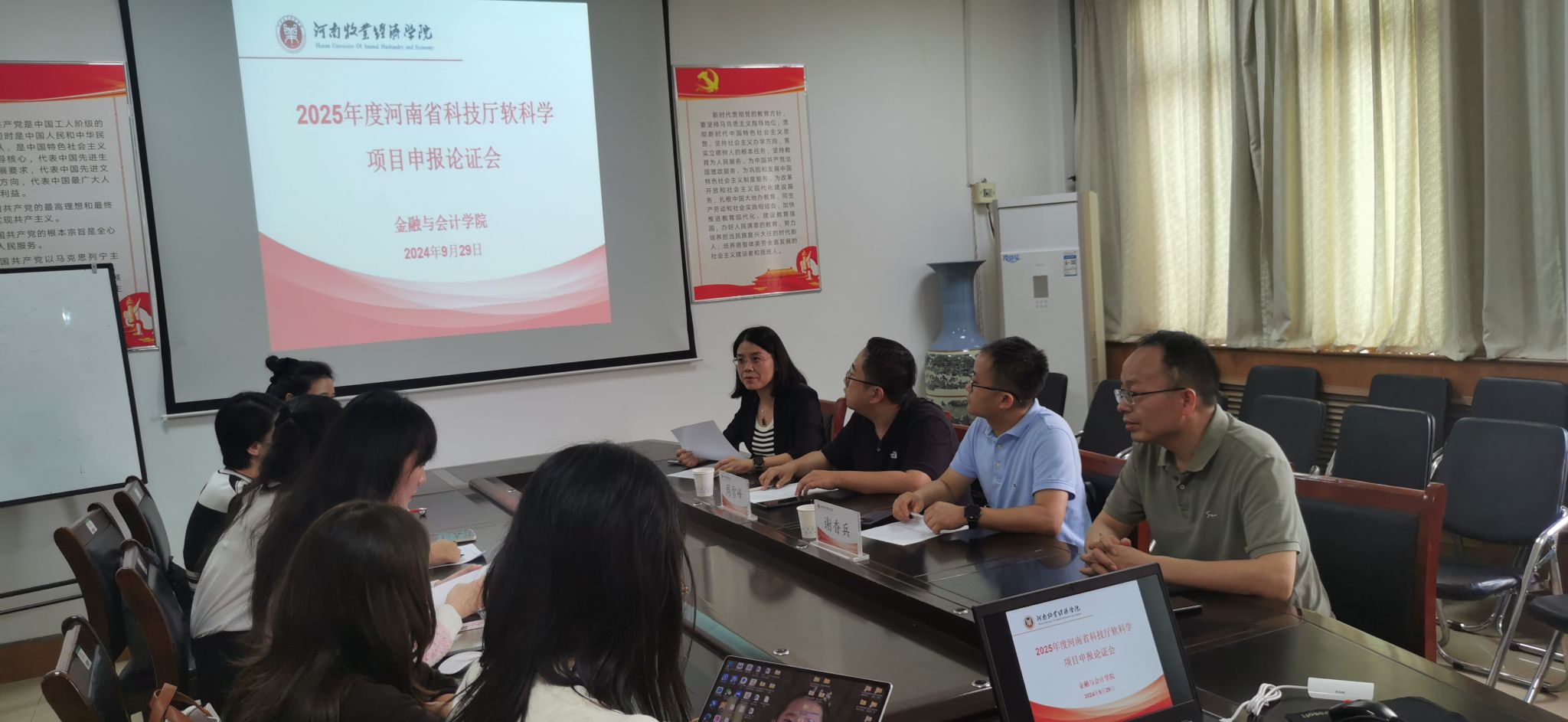 为进一步鼓励pa电子教师积极参与科研项目申报,提高河南省科技厅软科学项目申报质量,不断提升科研能力与水平。2024年9月29日下午2:30,pa电子官方网站在教学楼514会议室召开2025年度河南省科技厅软科学项目申报论证会。本次论证会邀请河南财经政法大学会计学院院长谢香兵教授和郑州航空工业管理学院商学院副院长周雪峰教授作为评审专家。pa电子官方网站院长贾宪军教授、项目负责人及部分教师参加了论证会。会议由副院长崔海红博士主持。