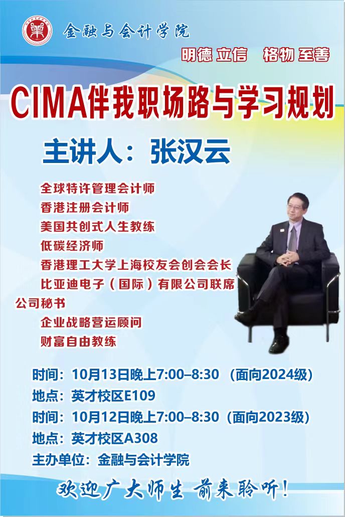 2024年10月12日,pa电子官方网站邀请全国特许管理会计师,比亚迪电子(国际)有限公司联合公司秘书张汉云先生举行了“CIMA伴我职场路与学习规划”的讲座,此次讲座吸引了CIMA方向班在校大学生,旨在帮助学生们更好地了解管理会计领域的最新发展及职业规划。