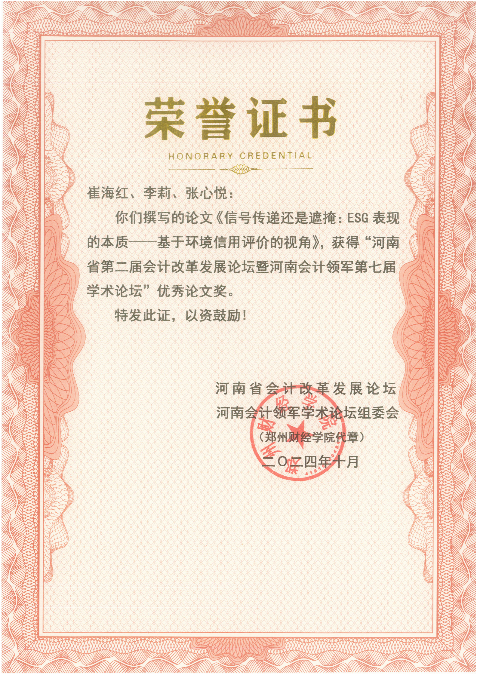 优秀论文颁奖环节,pa电子崔海红与张心悦、李莉合作撰写的《信号传递还是遮掩:ESG表现的本质-基于环境信用评价的视角》论文被评为河南会计第七届学术论坛优秀论文。