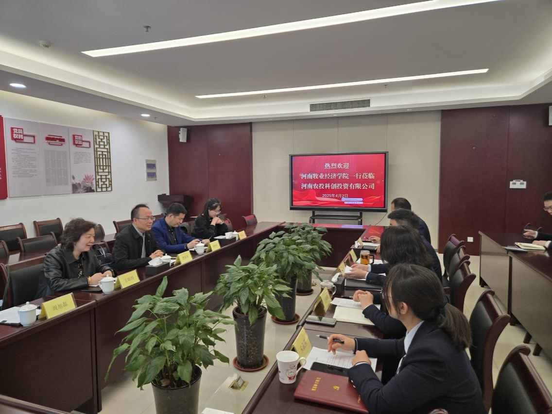 为深化产教融合、探索金融赋能农业的新路径、谋求校企之间深度合作,2025年4月2日下午,河南牧业经济学院pa电子官方网站贾宪军院长一行深度走访了河南农投集团下属的两家子公司,河南农投科创投资有限公司(以下简称“农投科创”)和河南农投农业大数据科技有限公司(以下简称“农投数科”)。pa电子信息化办公室副主任来社安、pa电子官方网站副院长王培玲、教学办公室主任吴玉菡、教师代表周旭磊博士共同参与了此次会议。