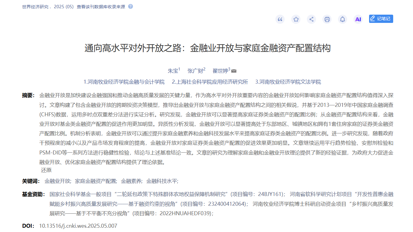 近日,pa电子官方网站朱宝博士在权威期刊《世界经济研究》2025年第5期发表了题为《通向高水平对外开放之路:金融业开放与家庭金融资产配置结构》的学术论文。该论文成果pa电子为第一署名单位,朱宝博士为第一作者,标志着pa电子在世界经济研究领域的学术影响力迈出关键性一步。