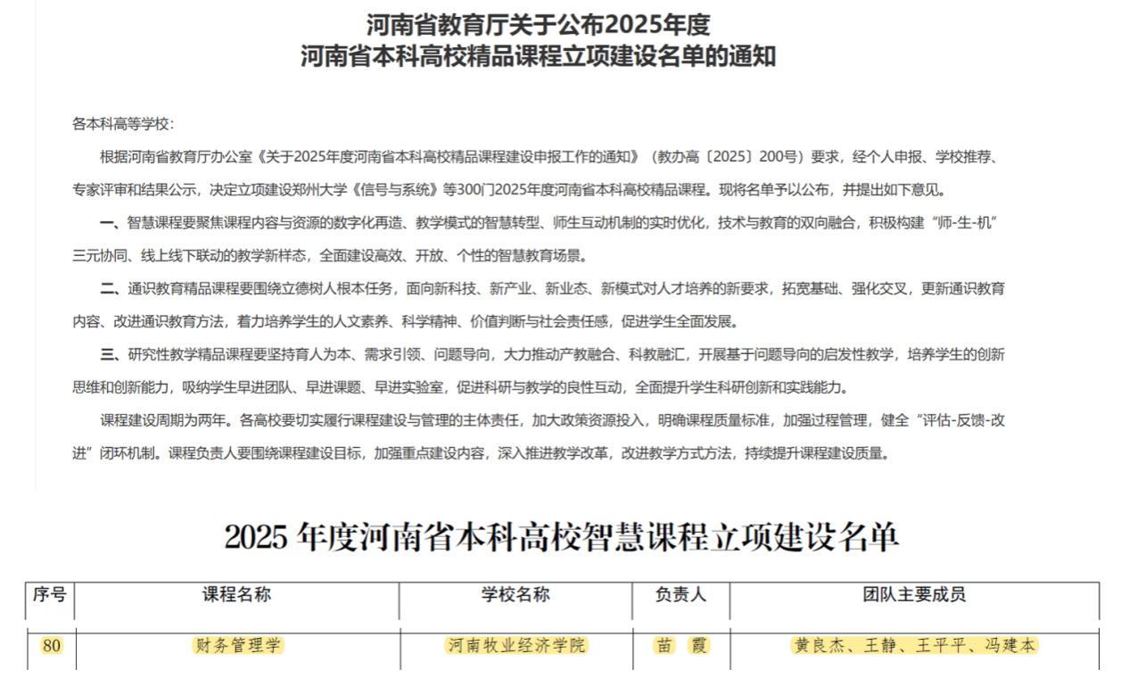 近日,河南省教育厅正式公布2025年度本科高校精品课程立项建设名单。经个人申报、学校推荐、专家评审等环节严格遴选,pa电子苗霞博士主持的《财务管理学》课程成功获批立项,入选省级智慧课程建设项目。