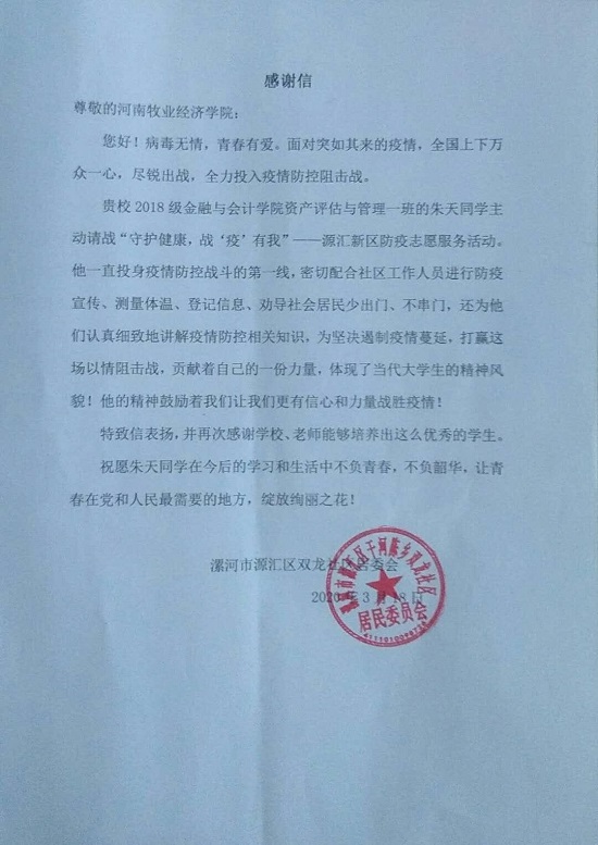 河南省漯河市源汇区双龙社区居委会发来感谢信,对pa电子pa电子官方网站2018级资产评估与管理一班的朱天同学在家乡疫情防控工作中的表现予以表彰和感谢。