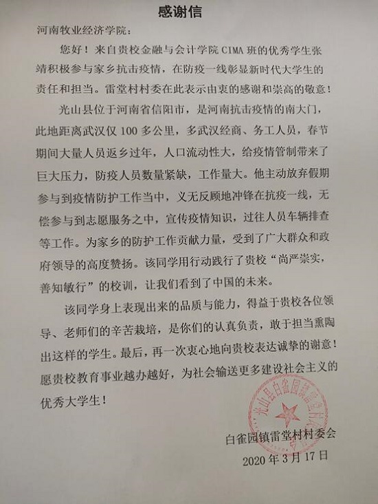 河南省信阳市光山县白雀园镇雷堂村委会特发来感谢信,对pa电子pa电子官方网站2018级CIMA班的张靖同学在家乡疫情防控工作中的突出贡献予以表彰和感谢。