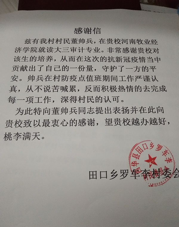 pa电子学生董帅兵,他对新冠疫情的记忆是从除夕的春晚开始的,再到第二天开始封村封路,之后一直通过电视新闻和网络来关注疫情的最新动态,再到观看元宵特别节目,当时他看到有这么一群守护者,他们扮演着逆行者的角色,与时间争分夺秒,极力挽救每一个需要呵护的生命。奋战在一线的他们一方面要承担着极高强度的工作,另一方面还要救治照顾着病人,而且他们随时也有被传染的风险。看到这里,他深受感动,心想要做些力所能及的事情。于是他自愿加入到志愿者服务中去,在村防疫点做志愿工作,因为只有这样他才会觉得自己和一线工作者是并肩作战的。