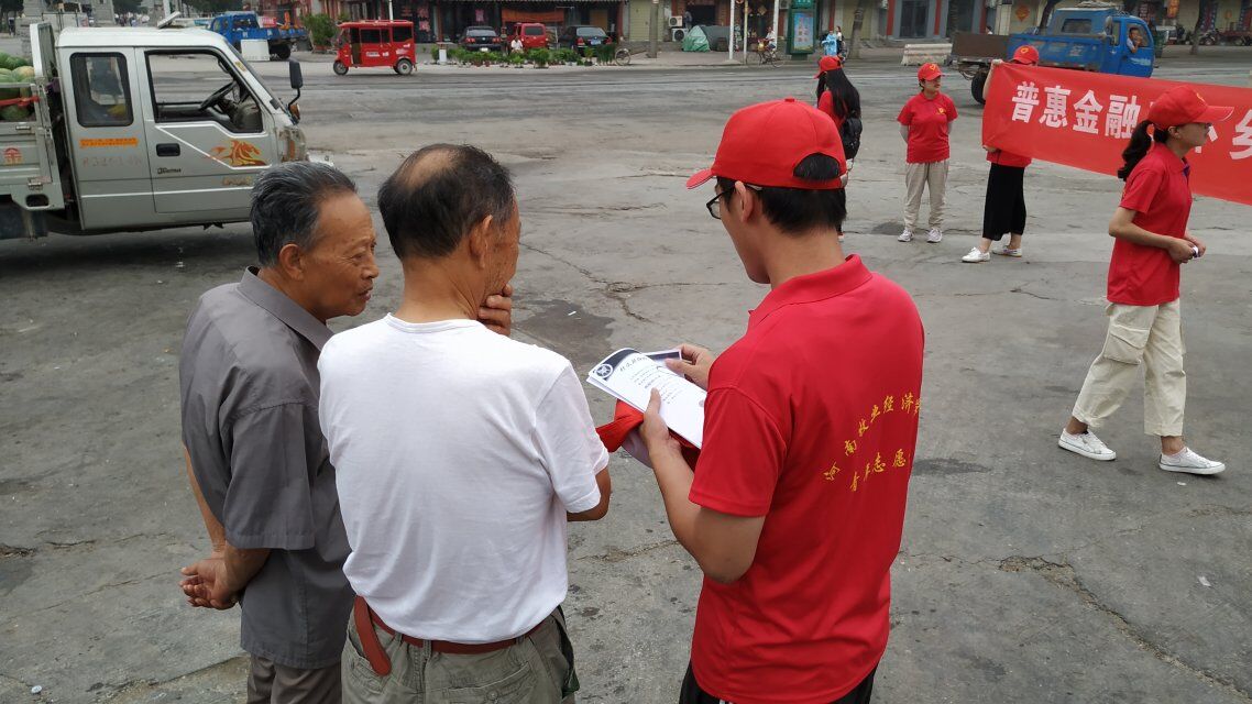 上午六点我们来到了浚州街道早上人流量较大的集市附近,继续采用易拉宝与宣传页相结合的宣传方式,开始了一天的宣传。在早上,我们主要的宣传对象为中老年人,这些中老年人虽然对普惠金融的了解程度较低,但是对我们的宣传却有着极大的热情,纷纷驻足在我们的展板前,我们宣传开始后不到两个小时,我们携带的宣传页就已经发完,这次宣传所收到效果大大超出了我们的预计。