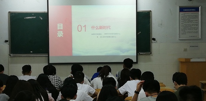 为深入学习贯彻习近平新时代中国特色社会主义思想和党的十九大精神,扎实推动党的创新理论成果深入人心,金融学院团总支学生会学生干部肖雷同学2018年5月7日于E202召开了题为“中国特色社会主义进入新时代赋予当代大学生新的责任和使命”的宣讲报告。金融学院100余名学生参加了此次报告。