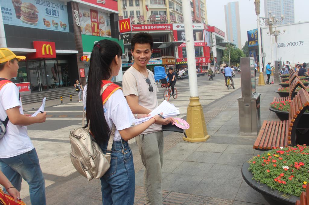 参观结束后,下午,志愿者们在二七广场开展了社会调查和宣传活动。与社区相比,二期广场人口流动性较大,志愿者们成功发放和回收调查问卷63份,发放宣传页一百多张。除了调查和宣传活动,志愿者们不忘提醒路人,牢记党的生日,不忘二七工人运动。