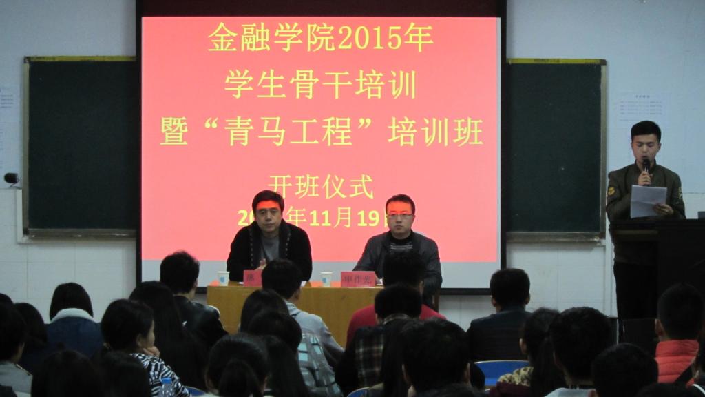 开班仪式由申作光老师主持。首先,由2015级投资学二班肖雷同学宣读《金融学院2015年学生骨干培训暨“青马工程”培训班实施方案》。