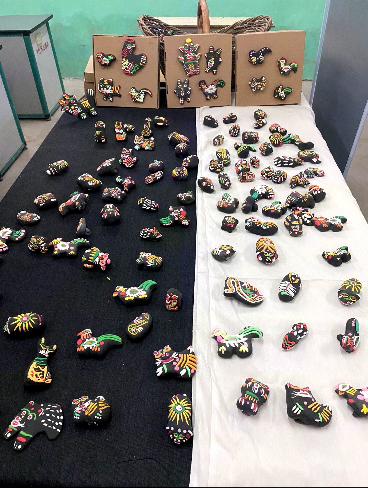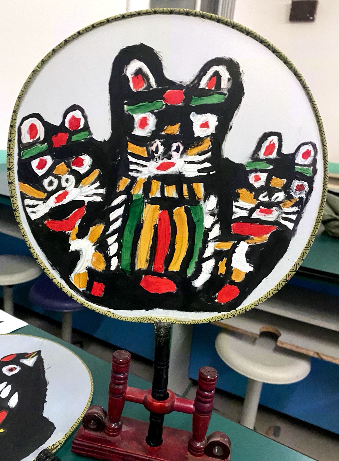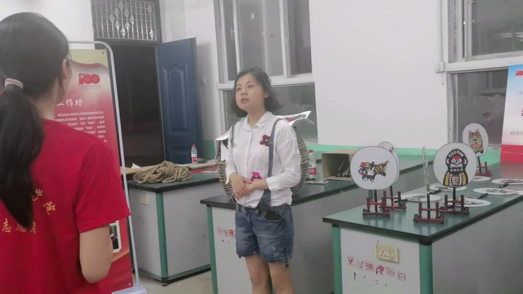 今天的最后一站是追光实践队对非物质文化遗产“泥泥狗”的探寻。“泥泥狗”是河南省淮阳县泥玩具的总称,又叫“陵狗”,传说是为伏羲、女娲看守陵庙的“神狗”,它承载着远古崇拜,被专家称为中国原始社会的“活化石”,列入国家级非物质文化遗产名录。追光实践队采访到的西姜寨乡中学的杜老师,其主要负责开展校园“泥泥狗”手工课程。在我们的采访过程中,杜老师为我们介绍了“泥泥狗”的神话传说、制作过程和配色讲究。队员们听完无一不感叹艺术与民俗文化的完美结合。在动手制作过程中,杜老师向我们介绍制作“泥泥狗”的材料。由于传统制作工序复杂,材料获取难度大,不易普及,所以杜老师对其做了一个创新。将传统的泥替换成超轻粘土,这样极大的提高了“泥泥狗”的可操作性,让同学们都可以亲手制作,既提高了孩子们的动手能力,又将传统文化引入了校园,充分体现了传统工艺与现代化的结合。最后老师为我们展示了栩栩如生的作品,不仅有“泥泥狗”本身,还有“泥泥狗”板画,“泥泥狗”扇面等各种创新衍生艺术品,队员们有了更浓厚的兴趣。在非遗的传承与发扬过程中,跟上时代的步伐十分重要,年轻一代更应该肩负起这份责任,将这薪火代代相传。
