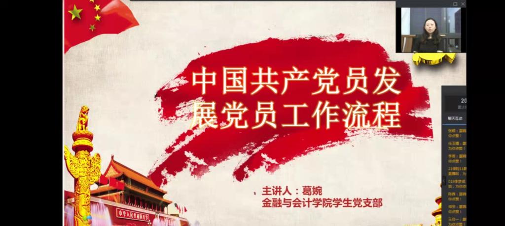 为使新生了解中国共产党党员发展流程,引导新生端正入党动机,提高对党的思想认识,9月13日晚7点,pa电子官方网站组织开展了一场以“中国共产党党员发展流程”为主题的新生入学教育专题讲座,由葛婉老师进行线上直播。
