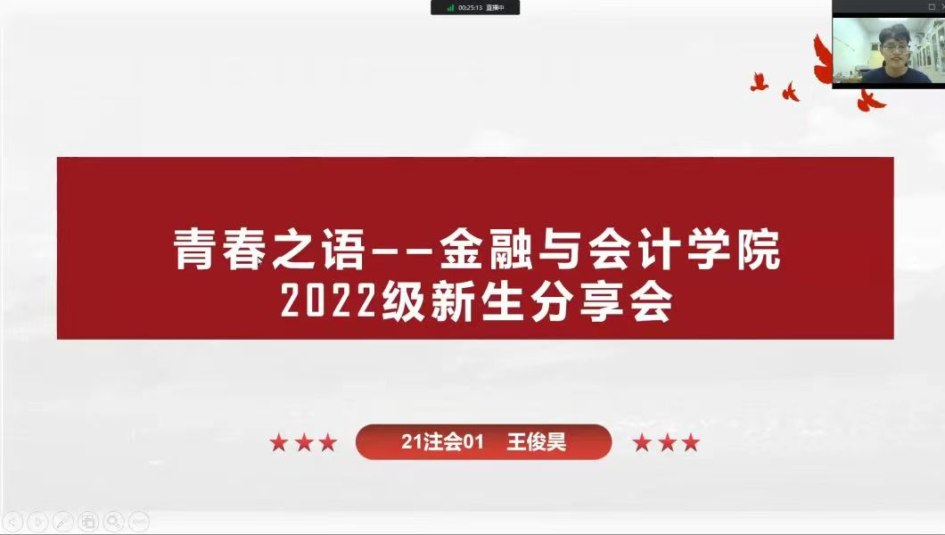 2022级新生报到在即,为缓解同学们即将开启大学校园生活的紧张与迷茫,同时向新同学们介绍丰富多彩的校园生活,pa电子官方网站于9月17日晚举行“青春之语”2022级新生分享会。此次分享会由20注会01翟莹洁、邢宇鑫,21注会01王俊昊三位同学主持,在轻松幽默的氛围中向同学们分享了他们关于社会实践、专业竞赛等校园学习生活的内容。