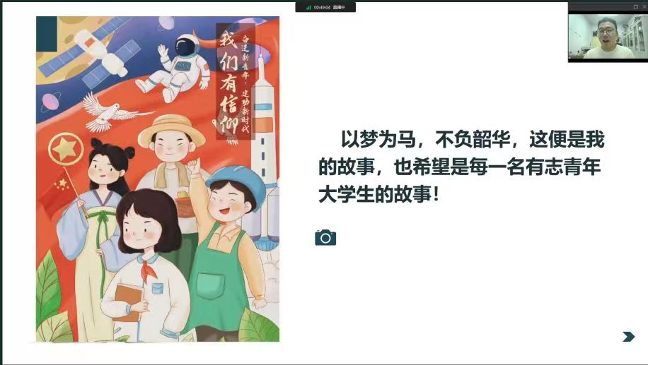 分享会中,翟莹洁同学与王俊昊同学分别对学习日常,学科竞赛进行细致讲解,让同学们深入了解专业内容,掌握学习方法。同时也以亲身经历讲述自己参加学生组织、社团活动、社会实践活动等所带来的成长与收获,鼓励同学们积极参与相关活动,追求远大理想,坚定崇高信念,促进自身德智体美劳全面发展。正所谓:热血报国当少年,岁月无悔正青春。2019年,志在军营的邢宇鑫同学积极响应国家号召入伍从军。他以亲身经历令同学们感受到保家卫国的光荣,激发了广大青年同学的报国参军热情。