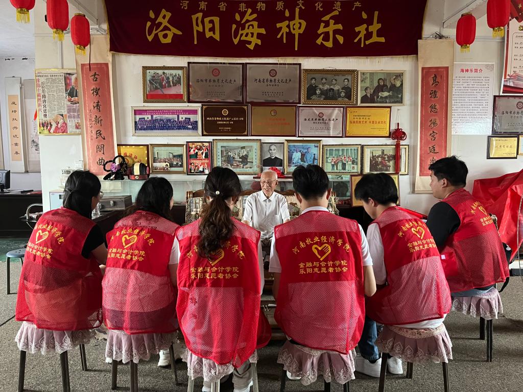 郭老热情为队员们讲述自己与海神乐的故事,介绍海神乐的起源和演奏时所用到的乐器、乐谱,并为大家现场演唱一段《苏武牧羊》。谈到海神乐的传承,郭老道:“海神乐”传承创新依然面临原地踏步、关注度不高等难题,我们一定要守住它,传承传统文化一定不能忘根。为了洛阳海神乐能够久传不衰,郭老将继续努力,在保留古谱老曲的基础上,吸收创新近年来的催人奋进新曲,散发时代气息,使海神乐走出洛阳,走出河南,走向海内外。