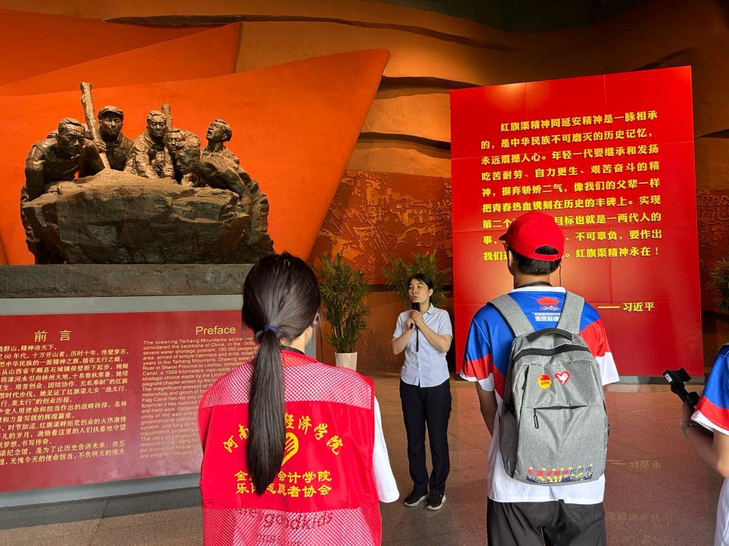 纪念馆以红色为基调,远远望去,似一条红飘带坐落在山间。实践团在讲解员的带领下,走过了515米长的展线,一幅幅惊心动魄的修渠画面,一个个随工地行走的“林红村”,一座座绳索捆脚防掉摔的“神工铺”……让大家真正感受到了那段荡气回肠的艰苦岁月。